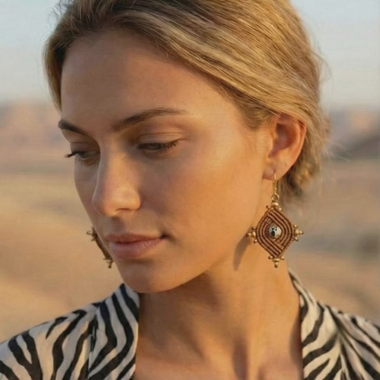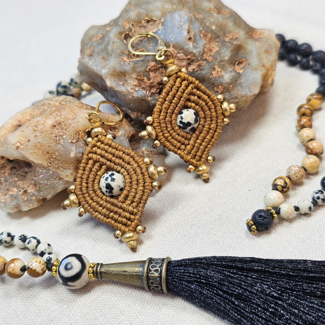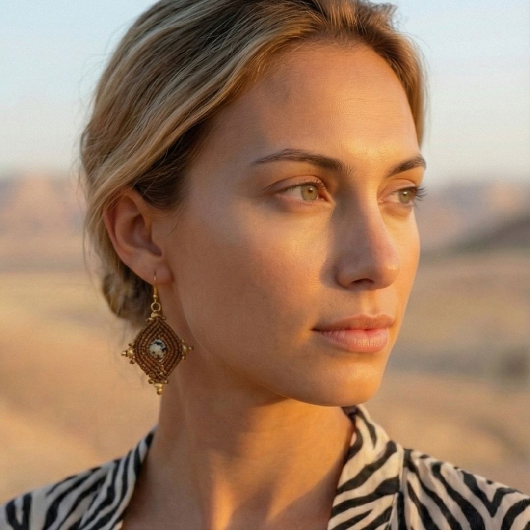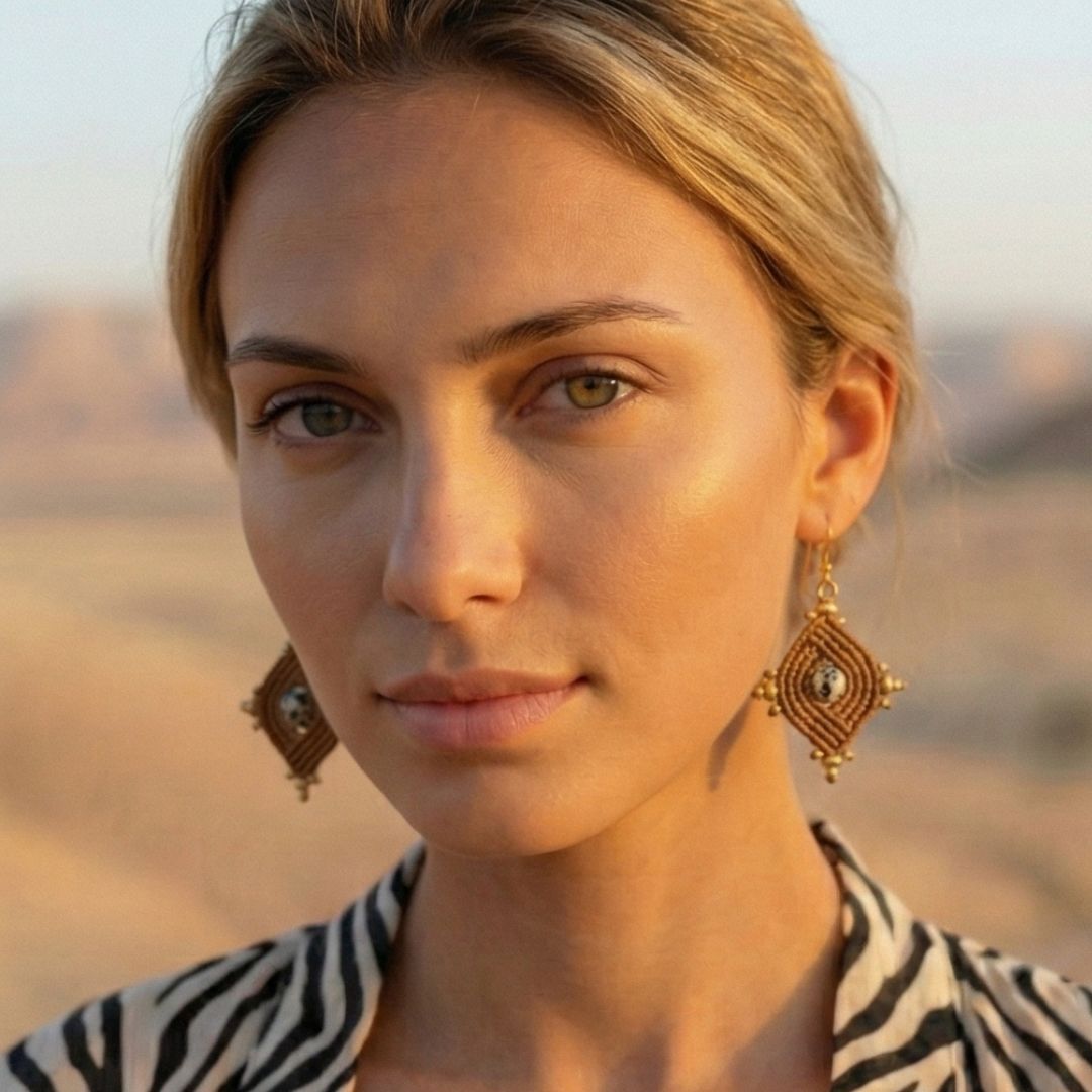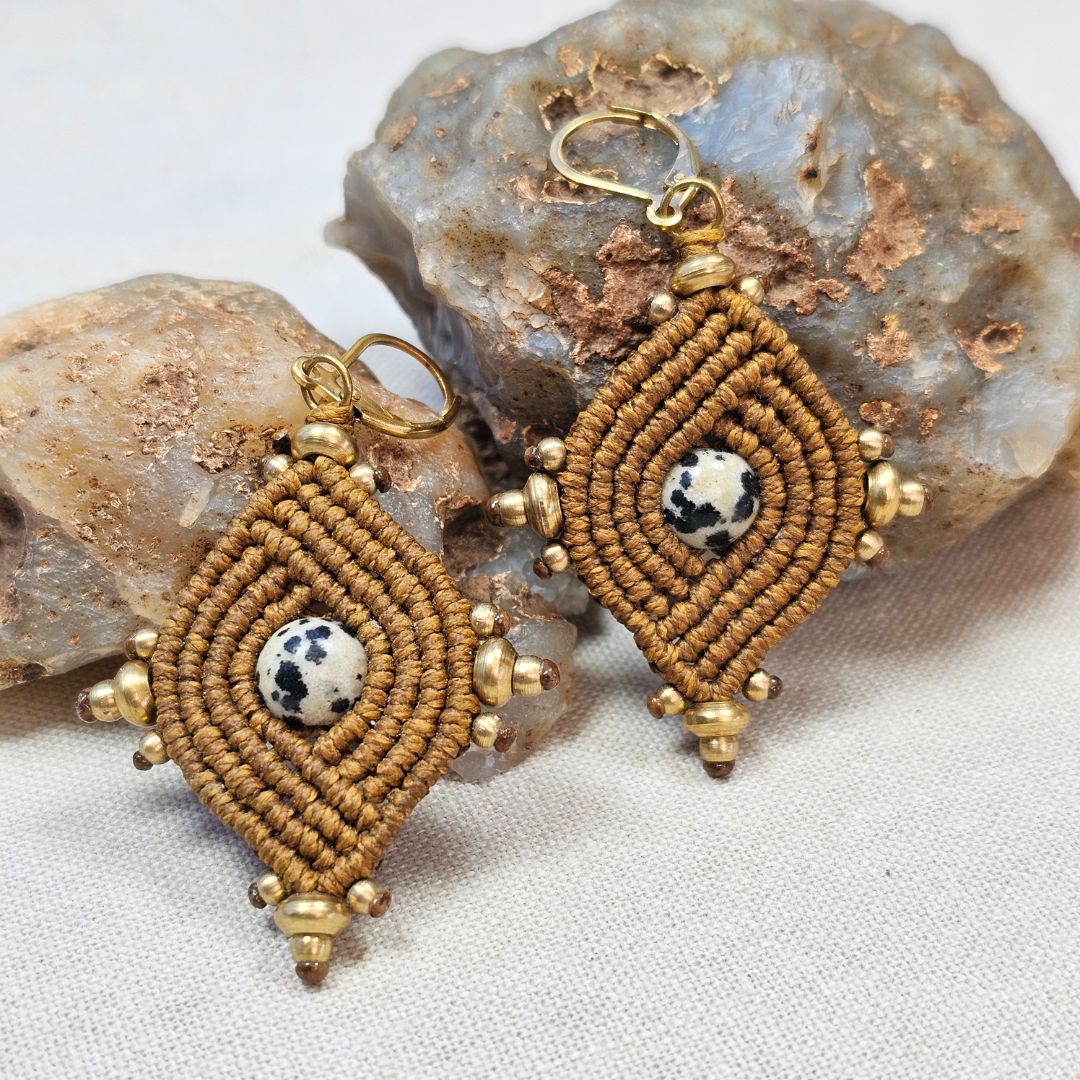 עגילי 'הופי' בעבודת יד, עם חיבור עמוק לאדמה ולצורה הגיאומטרית שמאפיינת את תרבות ההופי. מקרמה מחוטי שעווה חומים יוצר מבנה יציב ומדויק, ובמרכזו חרוז ג’ספר דלמטי שמכניס אופי טבעי ושקט. חרוזי בראס מדגישים את הקווים השבטיים בתנועה עדינה. סוגרי סטיינלס סטיל מוזהבים היפו-אלרגניים משלימים נוכחות חמה ונוחה.