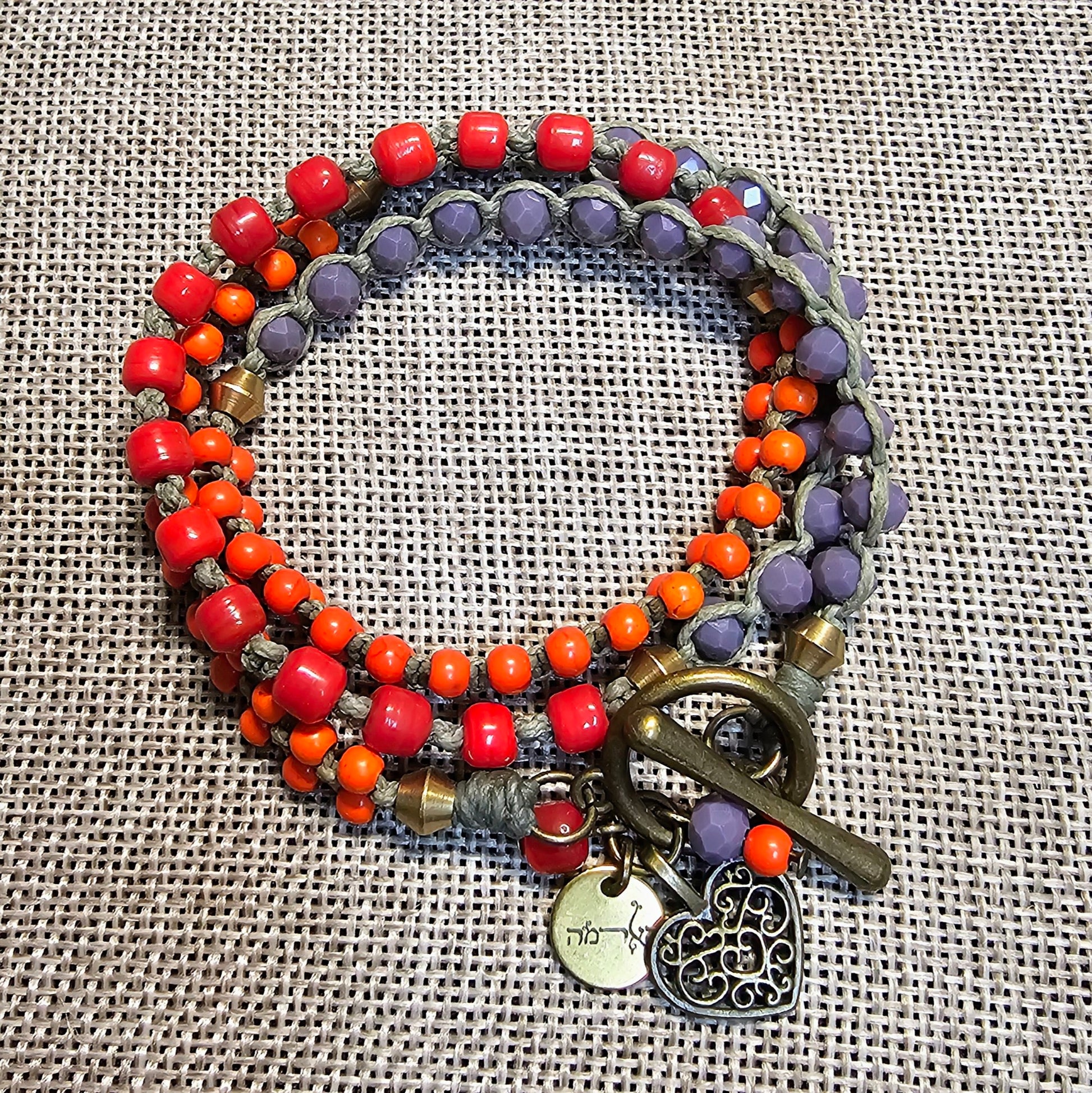תכשיט מלא חיים בצבעוניות בוהמיינית - זהו צמיד 'ברזיל' עם תליון לב. חרוזי זכוכית צבעוניים, היולייט וקריסטלים נוצצים נשזרים עם חרוזי בראס בקשירות מקרמה ליצירת מראה עשיר ותוסס. הסוגר הקדמי מדגם T ותליון הלב מבראס מושחר מוסיפים טאץ' ייחודי של אהבה וחיבור פנימי. הצמיד מתלפף שלוש פעמים סביב פרק היד, ויכול לשמש גם כשרשרת צבעונית ורבת-שימוש.