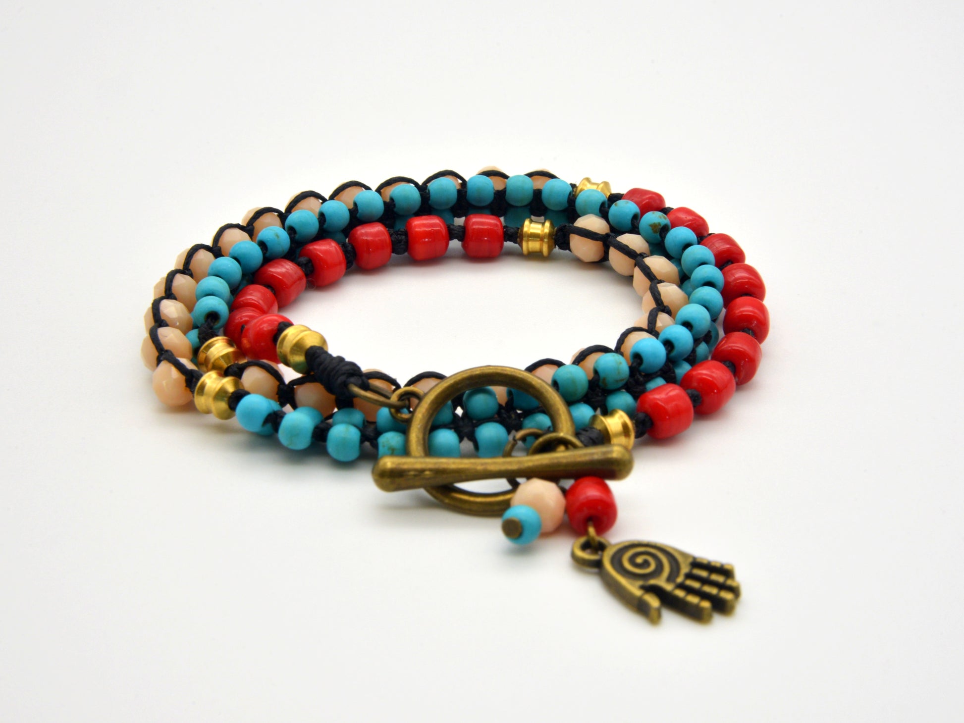 צמיד 'ברזיל' עם תליון חמסה מביא איזון עדין בין נוכחות בוהמיינית לבין סמליות רוחנית. חרוזי זכוכית, היולייט וקריסטלים נוצצים נשזרים עם חרוזי בראס בקשירות מקרמה ליצירת תכשיט בעל עומק ועדינות. הצמיד מתלפף שלוש פעמים סביב פרק היד, ויכול לשמש גם כשרשרת רב-שימושית. הסוגר הקדמי מדגם T ותליון החמסה מבראס מושחר מוסיפים משמעות של הגנה וחיבור פנימי.