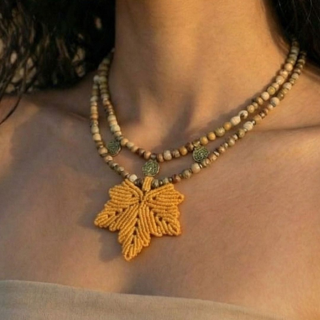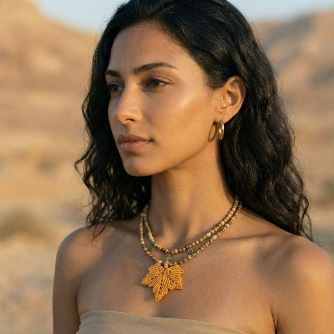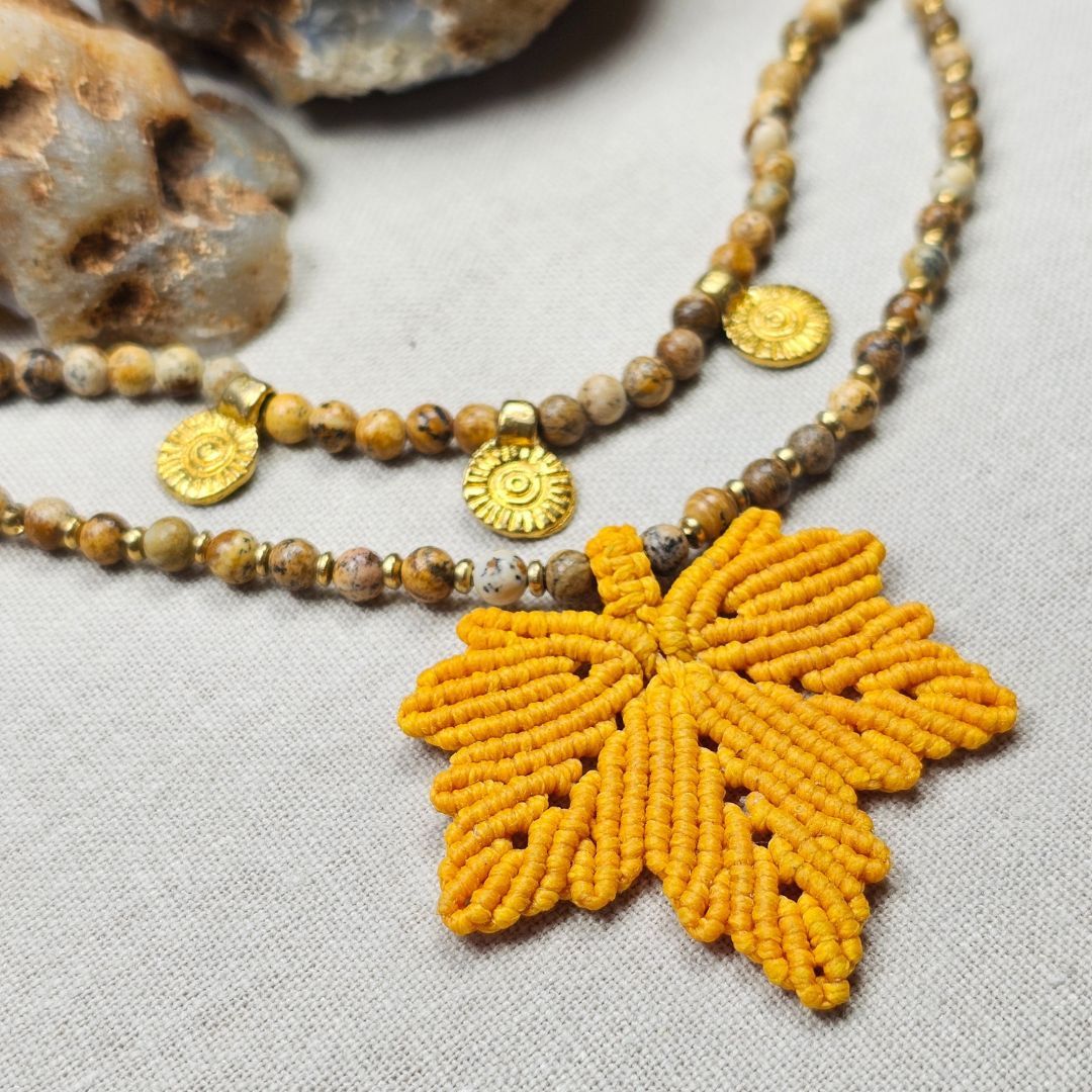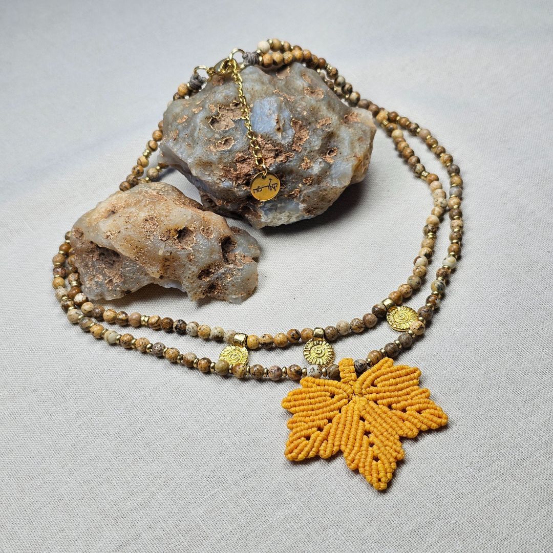 שרשרת 'אלה' בעבודת יד, במראה שכבות עשיר שמוסיף עומק ונוכחות. שכבה קצרה עם תליוני בראס מוזהבים משתלבת עם שכבה ארוכה יותר הנושאת תליון עלה מקרמה בגוון צהוב חם. חוטי שעווה, חרוזי ג'ספר פיקצ'ר וחרוזי בראס יוצרים תנועה טבעית ואור רך על הגוף. הסגירה ושרשרת ההארכה מסטיינלס-סטיל מוזהב מאפשרות התאמה נוחה.